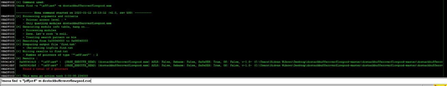 The picture above shows that there is a module in dostackbufferoverflowgood.exe. Afterward, find the JMP ESP instructions located in the dostackbufferoverflowgood.exe module.
