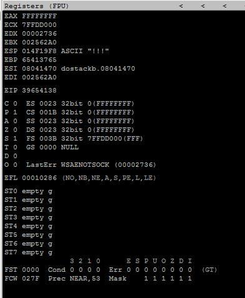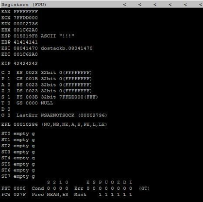 Once the character is sent, the application will crash. This allows the character stored in the EIP registers to be viewed using the debugger.