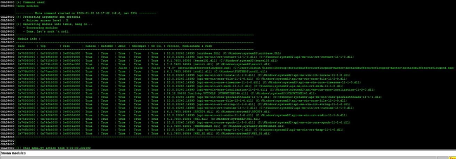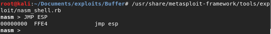 8. Use tools such as nasm to know the JMP ESP instruction in code form. In this case, JMP ESP is also known as xFFxE4. Then, utilize the MONA Immunity Debugger to identify potential modules that may have the JMP ESP instruction using the !Mona modules.