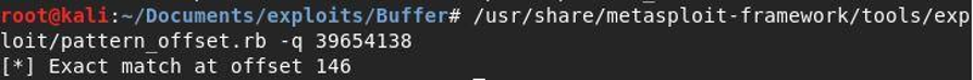 5. Use the /usr/share/metasploit-framework/tools/pattern_offset.rb command to find the position of the character found in the EIP register. As seen below, the character above (value: 0x39654138) is located in the 146th character out of the 150 bytes string that we have sent.