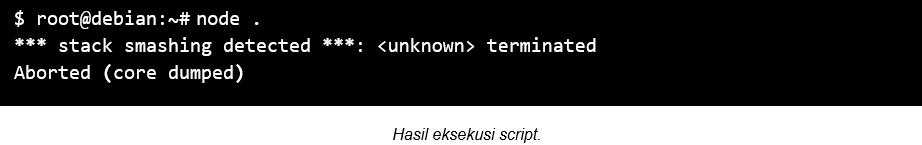 Selain pesan eror korupsi data seperti gambar di atas, menjalankan script bisa juga menyebabkan program untuk crash. Para hacker bisa mengontrol string dan code yang akan diinput ke dalam proses heap serta memodifikasi call stack. Hal ini akan menimbulkan beberapa masalah, seperti memberi kesempatan bagi para hacker untuk menjalankan remote code execution (RCE).